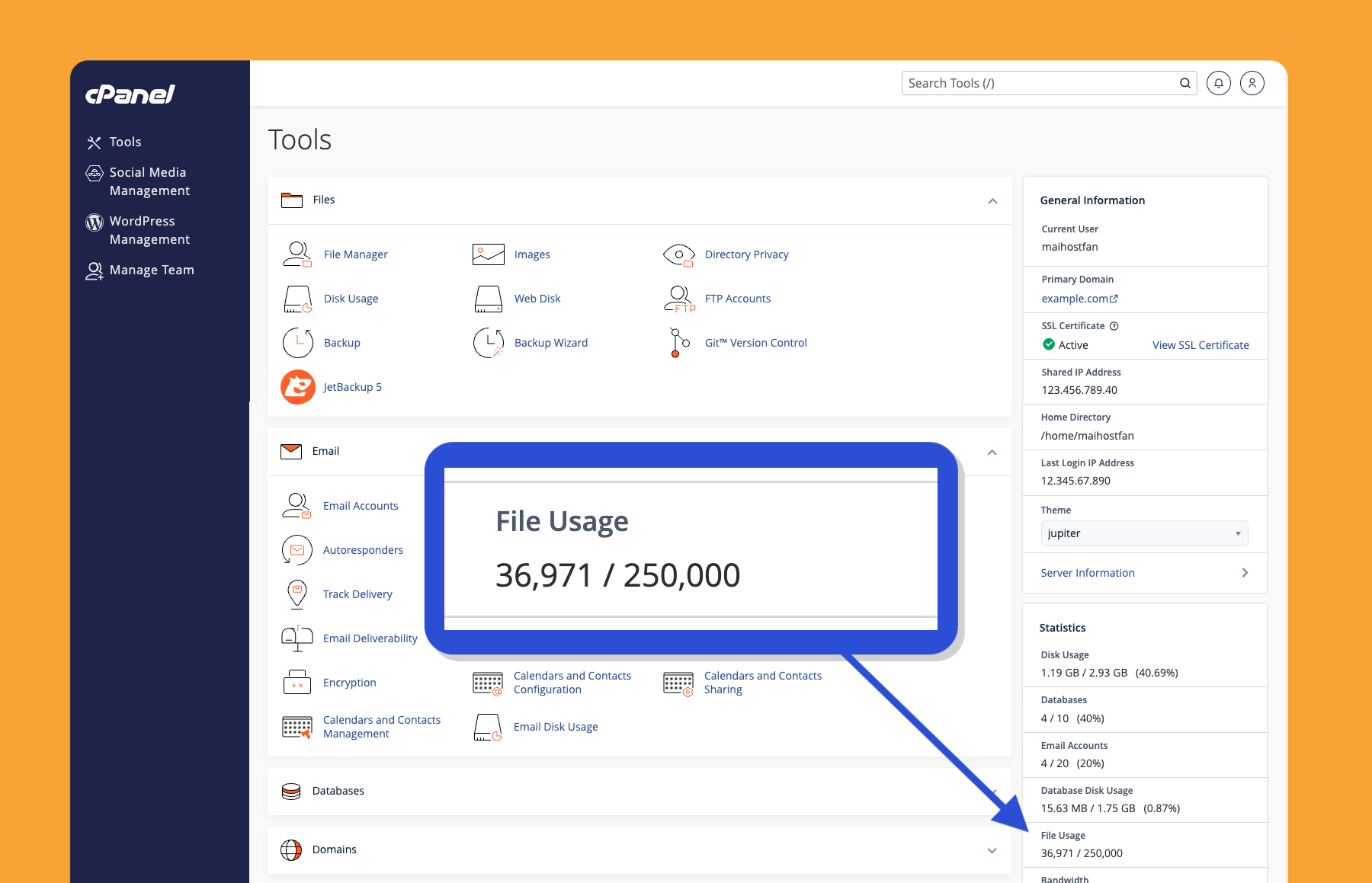 You can check your own number by logging into cPanel (here’s how) and looking under “Statistics” on the right hand side. You’ll see File usage in that list.