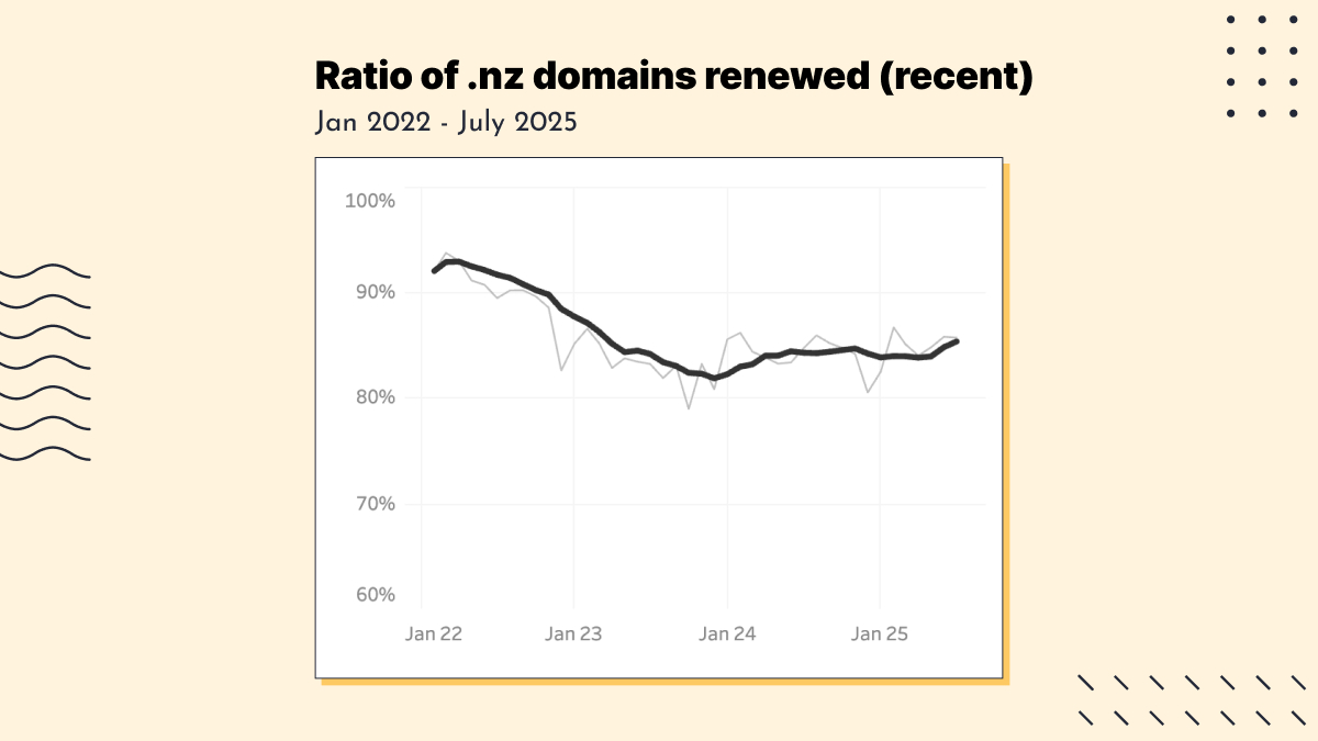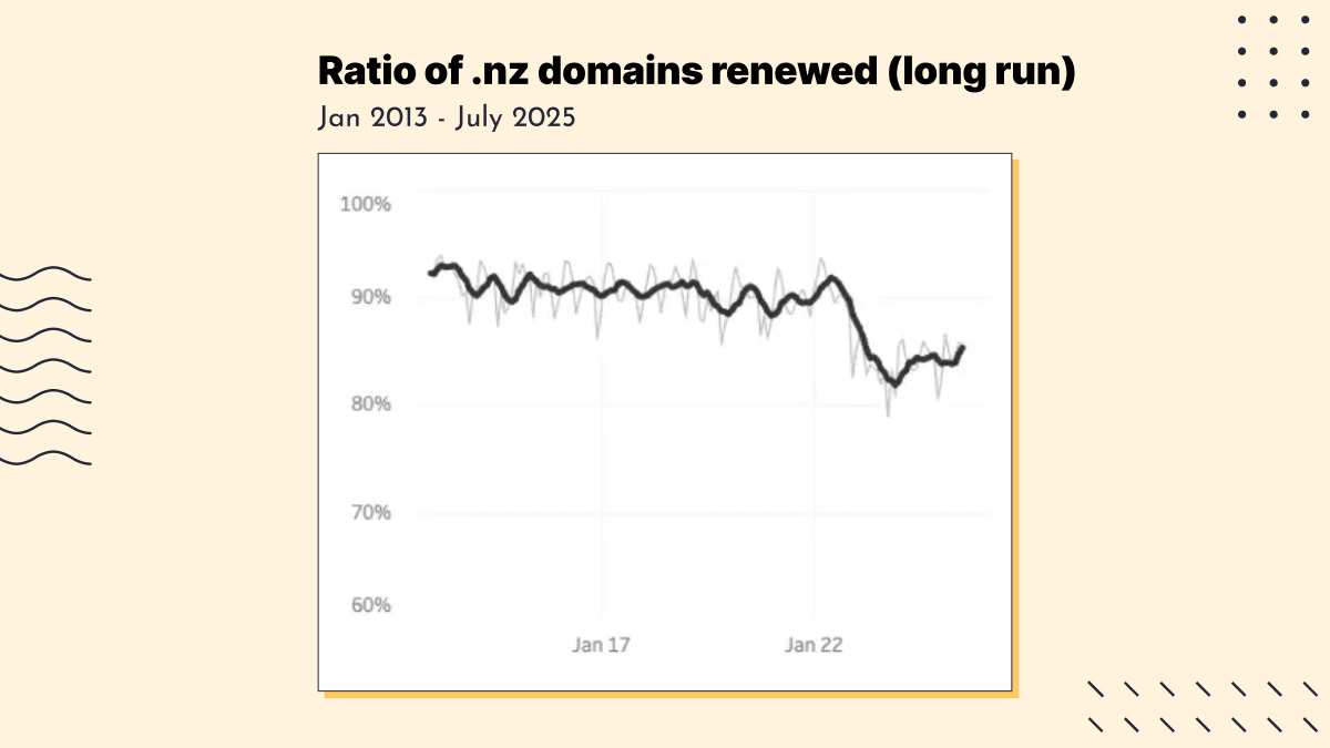 Small-sounding changes can make a big difference. When renewals ran at 80%, NZ needed to replace 1 in every 5 expiring domains just to stay where we were. At 90% that would be halved to only 1 in 10.