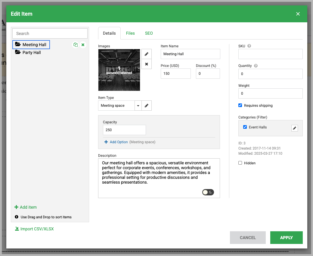 The builder allowed me to upload product images, write descriptions, and organise everything in a neat and user-friendly way. I created a new "Type" of product, "Meeting space", then added "Capacity" as a part of that type. The options here felt endless!