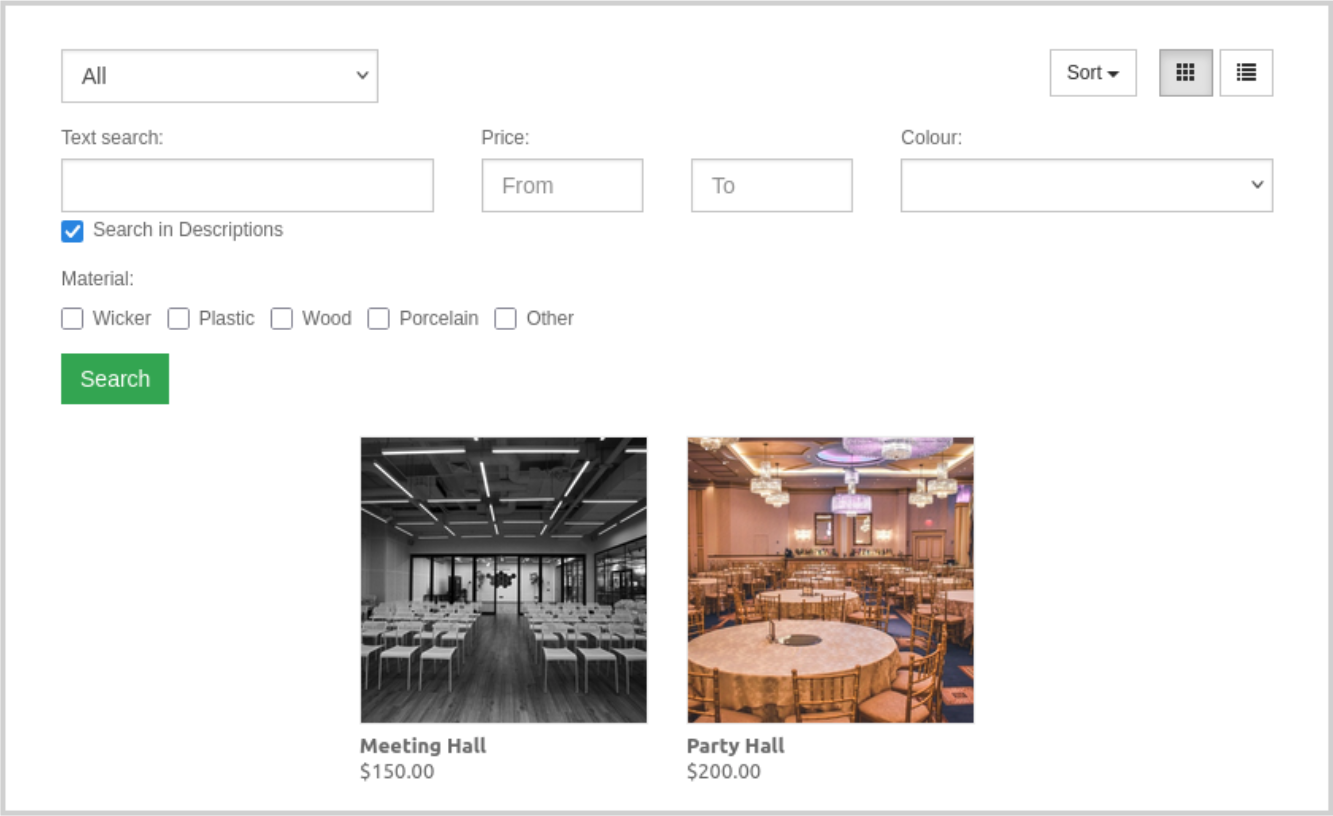 This is definitely somewhere where more time would have been more useful. You can see in the screenshot below that I was listing event venues, but the website still displayed the default options that describe each product as wicker, plastic, wood, etc. All of that is editable. You can see in the live website that I went as far as removing those options and the 'Colour' drop-down lost, but didn't get around to adding new ones (which could have been venue-specific options like seating capacity, indoor or outdoor, etc).